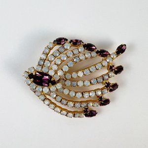Vintage Glam Prong Set Faux Opal and Purple Amethyst Rhinestone Gold Tone Brooch Pin