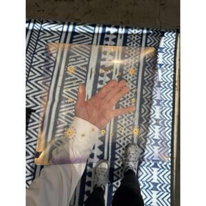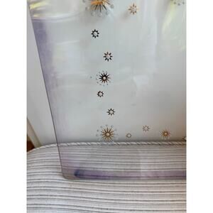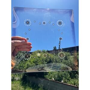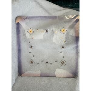 Good preowned vintage condition this gorgeous square glass plate is Glama Glass from the 1960s. Faded purple edges and metallic silver and gold atomic starburst patterns are all around the square. Some of the purple is rubbed or scraped. But there are no chips or cracks in this amazing unique plate. 11” square.