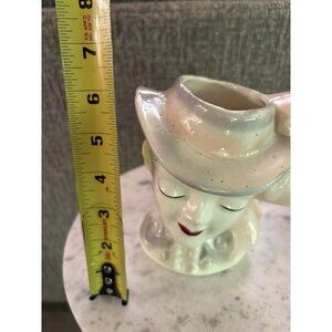 The Vintage Glamour Girl Headvase is a charming flower vase shaped like a lady head, featuring a Victorian style with a high collared riding outfit and a pink bow. Standing at a height of approximately 7 inches, this ceramic vase has a glossy finish. Perfect for adding a touch of femininity to any decor.
