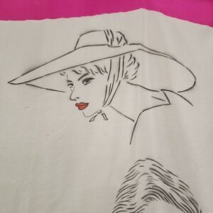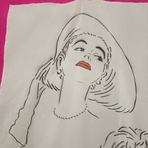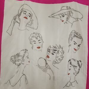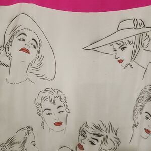 Vintage Glamour Girl Sketch Print Square Scarf Pink Border. beautiful sketches of women's faces in a sketch-like design. not sure of the material but it feels like silk.