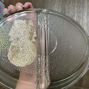 Vintage divided glass dish, never used but not in perfect condition. There is a tiny knick on the interior glass (pictured) and a manufacturer mistake within the glass (small white flake). It is still a great piece for a serving dish or decor but not baking.