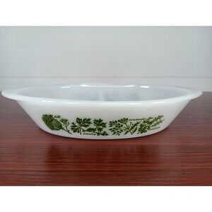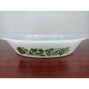 The Vintage Glasbake Herb Garden Milk Glass Divided Casserole Dish J2352, made in the USA in 1977, is a unique and decorative piece of cookware. This oval-shaped bowl features a charming Herb Garden pattern in white milk glass, with two compartments for serving. With a capacity of 1 quart, this original Glasbake casserole dish is both functional and stylish, with features like being oven-safe and having decorative handles. Perfect for cooking and serving dishes with a garden herb theme, this vintage piece adds a touch of nostalgia to any kitchen collection.