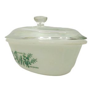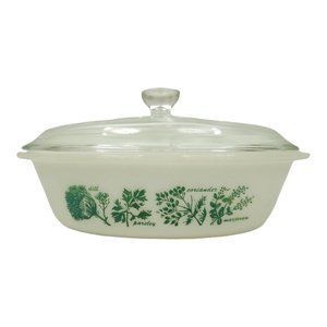 Vintage Glasbake J235 1Qt Casserole Dish With Lid Green Herb Garden Pattern Milk Glass Dill Parsley Coriander Marjoram