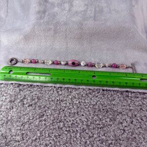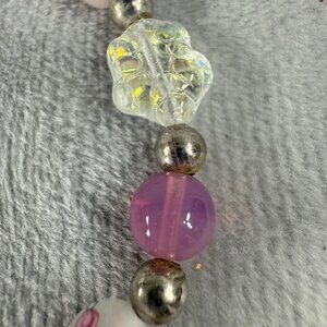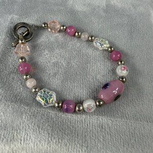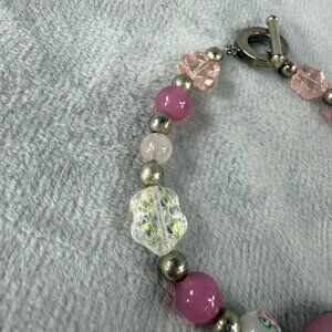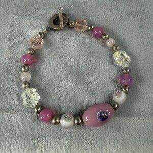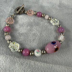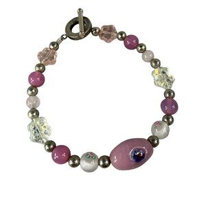 Vintage Glass Bead Bracelet With Toggle Closure & Pink White Silver Accents. Unbranded. Artisan Design. Wear as is or take apart and use the beads in your own creations.