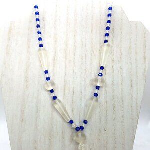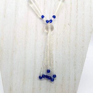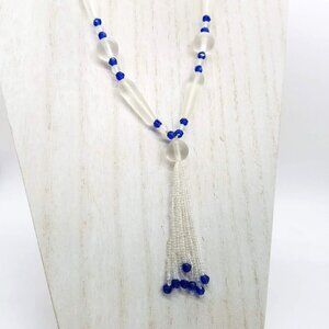 Vintage Glass Bead Tassel Necklace 31" Long Blue Clear Beads For Elegant Style