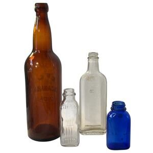 Vintage Glass Bottle Lot 4 Brown Clear Blue Apothecary Scientist Decor Alchemist