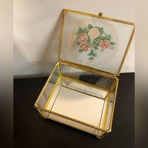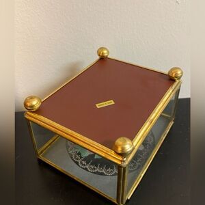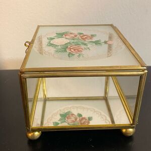 Vintage Glass Brass Jewelry/ Casket Box Retro Regency Mirror Container. Measurements are in the photos. Great to hold your keys by the front door, jewelry on your dresser or items in your bathroom counter. Would be SO cute to hold your rings for your wedding 🥹
