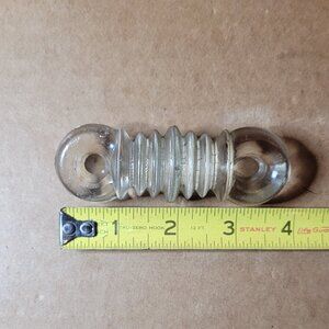This vintage glass cable strain insulator has served its purpose as an insulator and is now a unique collectible item due to its nostalgic design. Its sturdy construction and historical significance make it a desirable piece for collectors of vintage glassware and electrical artifacts.