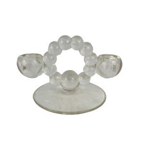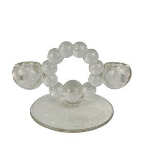This vintage glass candle holder features a unique circular design composed of glass beads, culminating in dual cups to hold candles. Its transparent glass construction adds an elegant touch to any setting, making it a charming and versatile decorative piece. Ideal for enhancing the ambiance of your living space or dining table with a classic, timeless look.
