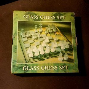 Vintage Glass Chess Set 32 Pieces Frosted and Clear w Glass Board and Box Board is app. 9 3/4" square King is app. 2 1/4" tall vintage condition - some gentle wear showing on the pieces and board. Still new in box. I think I got it a Christmas gift one year, trying to clean out some stuff from my closet.