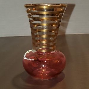 Vintage Glass Cranberry and Gold Mini Bud Vase with Applied Floral Pattern MCM