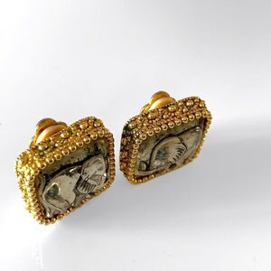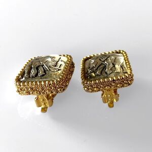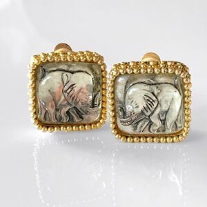 Vintage gold tone square glass elephant rhinestone accented clip earrings. Approx 1”x1”