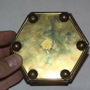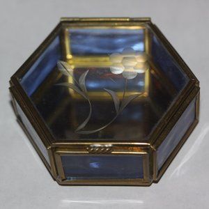 Vintage Glass Etched Flower Blue Clear Brass Trinket Jewelry Box