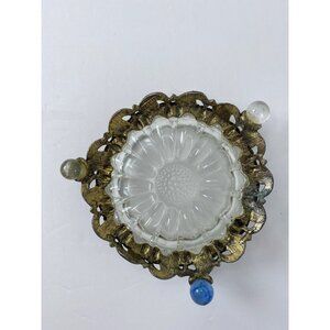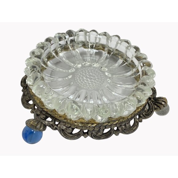 Vintage 4" Glass Flower Ring Dish/Pin Dish/Ashtray with a metal base. Nice pre-owned condition, with a unique detail - one marble leg is blue, others are clear. Beautiful glass flower design adorns this piece.