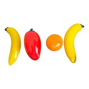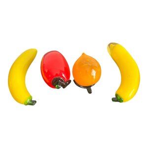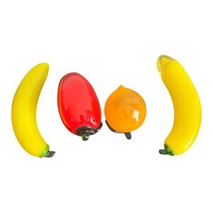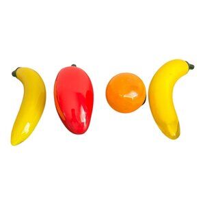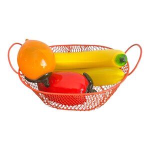 Decorative glass fruit figurines brighten home decor. Includes bananas, orange, and pepper in a vibrant red wire basket.