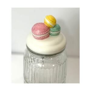 Add a touch of whimsy to your kitchen with this charming vintage-style glass storage jar featuring a ceramic lid adorned with pastel macarons in pink, yellow, and green. Perfect for storing cookies, candy, coffee, tea, or other small kitchen essentials. The ribbed clear glass body adds a classic look while allowing you to easily see contents.