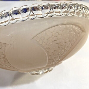 Vintage Glass Lightshade in thick textured pink & clear with 3-hole design for a hanging shade. Shapely floral motif has an Art Nouveau / Art Deco vibe. Clear scalloped bead rim and clear center will look stunning when lit. Minimal wear - no damage or flaws - excellent vintage condition.