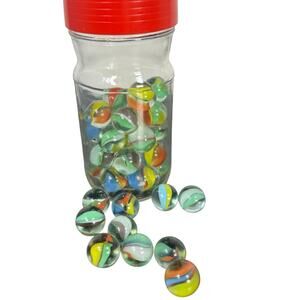 Lot of 39 vintage-style glass marbles in a variety of multicolor swirl designs. Includes a clear storage jar with a red plastic lid. These marbles are perfect for collectors, craft projects, game play, or display.