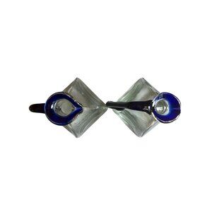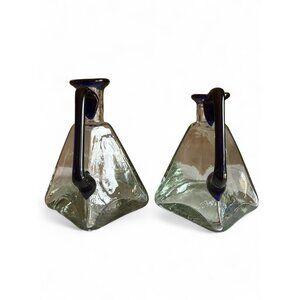 Vintage Glass Oil Vinegar Cruet Set Hand Blown Blue Rim Triangular Pitchers 2 Pc