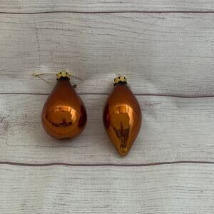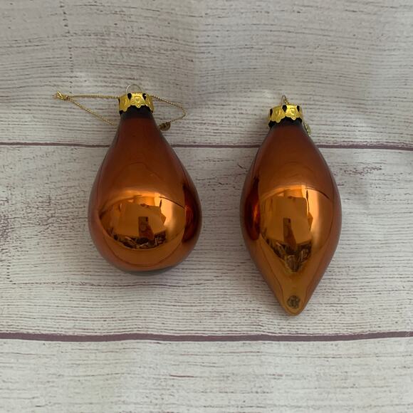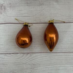 Vintage brown glass Christmas tree ornaments. This set of 2 is brown or may be considered copper or bronze in color. It has a gold hanging top and string. One is the shape of a teardrop and the other is marquis in shape. The are pre-owned with light scuffing.