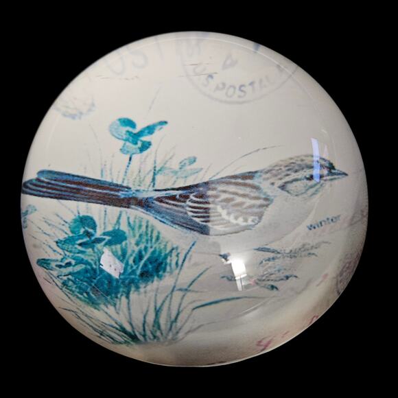 Beautiful round glass paperweight featuring a detailed winter bird illustration with foliage accents and faint vintage postal stamp graphics in the background. Clear domed top magnifies the artwork nicely. Great decor piece for desk, office, or bird lover display. Preowned with light surface wear from normal handling. No cracks or major damage. See photos for details.