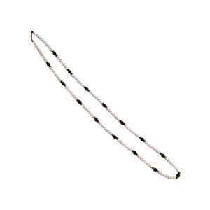 Elegant strand of glass pearls and either black glass or onyx beads. The pearls are heavy, so definitely not made of plastic, but a few of them up near the neckline where they got some wear on them have slightly peeling outer layers, that seem to be from a pearl shine layer being added over a white glass. Only a few have the wear and it isn't noticeable unless you're really looking for it. Great faux strand from the 50s or 60s.