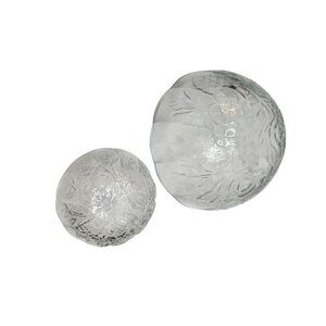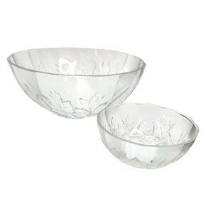 This Alco Glass Rose Pattern Chip and Dip Bowl Set features a vintage style, clear glass bowls with intricate floral etching. The set includes a 9" serving bowl and a 5" chip dip bowl.