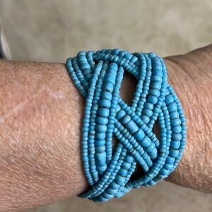 Here is a Vintage Glass Seed Bead Braided Wire Cuff Bracelet in fine condition with no damage. This measures 1.5” wide and it is wired so it will fit a rage of wrist sizes, my wrist in the picture is 6 1/2 inches. I have another bracelet just like this in yellow in another listing if you’re interested. I am a collector of jewelry and it’s time to part with some of my treasures
