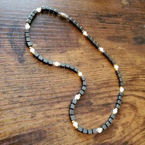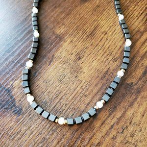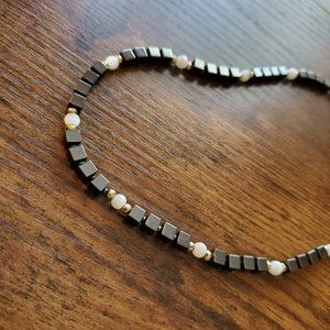 Vintage necklace, 16" choker length, has small square irridescent black beads and round white and gold color beads. The beads are either glass or stone such as onyx & white cat's eye quartz (definitely not plastic - they are cold to the touch).