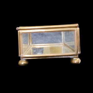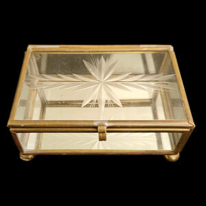 This is a vintage rectangular glass trinket/jewelry box with a brass-tone metal frame and mirrored bottom. The clear glass lid features an etched starburst design, giving it a classic mid-century style. Perfect for storing rings, small keepsakes, or as a vanity/dresser display piece.
