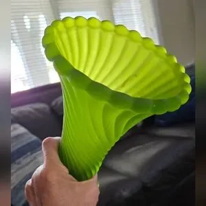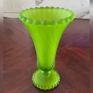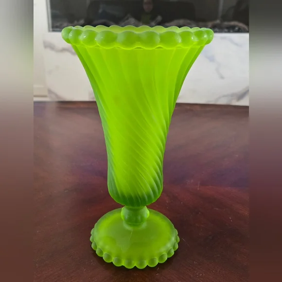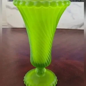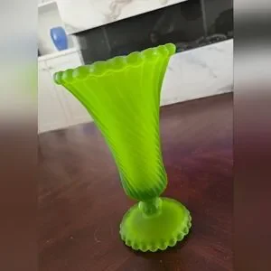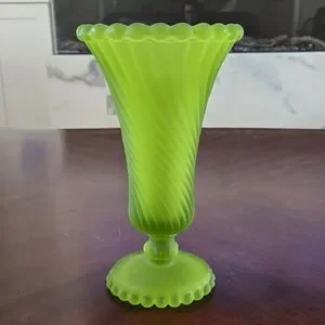 Elegant green glass vase with a swirl design. Perfect for home decor.