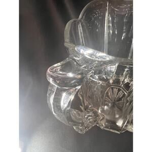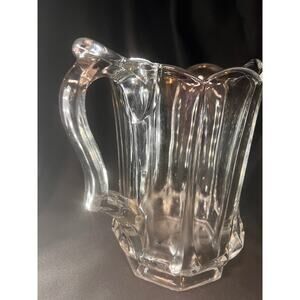 Vintage Glass Water Pitcher with a scalloped rim sits on an octagon base. Measures 7.75” tall from base to top of ice rim. Very pretty pitcher for flowers or display. Also good for normal use. Very good condition on this piece with no visible chips or cracks.