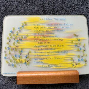 Vintage 1980's desk plaque in glass and wood by Papel Distinctive Giftwares of North Hollywood, CA. Made in Japan. Poem is titled "A Lifetime Friendship". 5-1/2"w x 4-1/2"h x 1-1/8"d. In very good vintage condition.