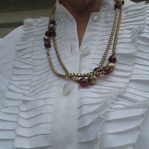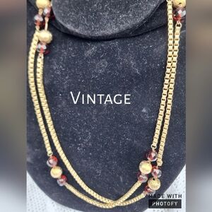 This is a brass necklace with a signature I cannot read.Faceted glass beads. Wear long or short