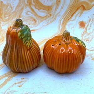 Fall is here!! Tis the season to dress up your table with this set of adorable shakers. Orange with green leaf accents and plastic stoppers. No chips or cracks. Perfect for autumn decor.