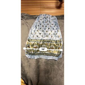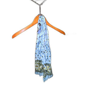 This Glentex scarf is new with tags. It features an intricate paisley pattern in shades of blue and green on a light blue background. Made from 100% nylon, it's lightweight, soft, and drapes beautifully. Made in Japan.