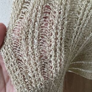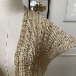 Vintage 70s Glentex open front cap sleeve cardigan that has an attached sash that you tie at the waist. Tan acrylic open weave with gold Lorax poly threading throughout. Made in Japan. Tag size one size fits most but that is vintage sizing, and modern sizing. I think it’s closer to a modern size small or medium. It’s featured on my size small dress form for scale. Laying flat measures 20 inches shoulder to hem and 19 inches armpit to armpit.