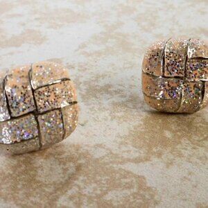 Step into retro glam with these vintage clip-on earrings. Featuring a bold square geometric shape, they sparkle with multi-color glitter over beige enamel and gold-tone metal. Secure clip-on closure makes them perfect for non-pierced ears. Lightweight and statement-worthy — ideal for parties, themed events, or adding sparkle to your everyday look.