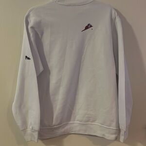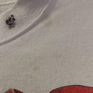 This sweatshirt does have some staining as pictured as well as some pilling. I did use a sweater shaver on the sweatshirt but didn’t want to get too close to the graphics so there are still some areas of pilling.
