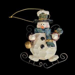 Vintage Glitter Snowman Ornament with Bells & Wire Skates Christmas Holiday