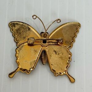 Beautiful vintage enamel butterfly pin in colors of greens, orange, yellow with black outlines and gold accents. Gorgeous butterfly pin, perfect for a gift or for those who love vintage pieces. Great pre-owned condition, no issues. Measures approximately 1.75x1.25”.