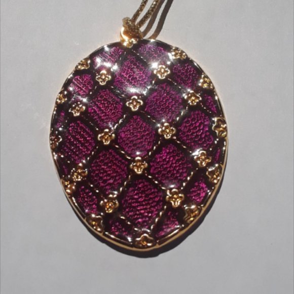 Vintage Gloria Duchin Purple and Gold Easter Egg Ornament. Beautiful heavy gold metal Easter egg shaped ornament with metallic purple background. Back reads Gloria Duchin/ Made in USA/ 1995.