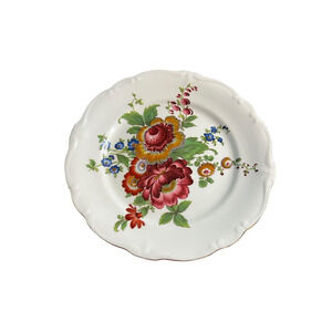 This vintage Gloria fine porcelain Bayreuth West-Germany 10" plateshowcases a beautiful floral design, perfect for all occasions. Made in Bavaria, Germany in the 1980s, this round plate feature a glossy finish and are decorated with a multi-color floral pattern. This German porcelain plate is a lovely addition to any table setting, adding a touch of elegance and charm to your dining experience.