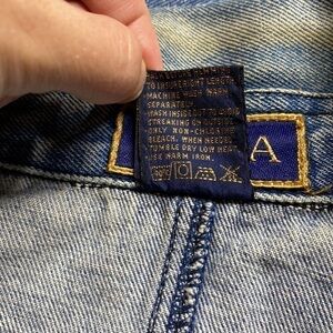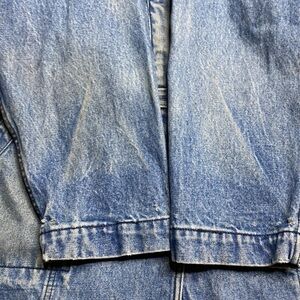 Last six close up pictures show condition flaws. Wear to denim, bottom end of zipper has a seam separation (zipper is in working order) and is an easy fix, last two photos show missing button on sleeve end and inside bottom back slit.