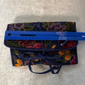 Beautiful floral fabric wallet with vibrant colors. Features a blue trim and a floral pattern with red, yellow, and purple flowers.