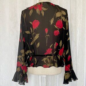 Vintage Gloria Vanderbilt Women's 90's Blouse Sheer Black Rose Whimsigoth Alt Goth Romantic Flowy Long Sleeve Ruffle Button V-neck Top