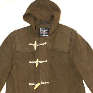 Classic vintage Gloverall duffle coat crafted from a warm and durable 80% wool, 20% polyamide blend. This timeless greenish brown coat features a hooded design, barrel toggle buttons, and a long pea coat silhouette—perfect for cold weather and classic style lovers.