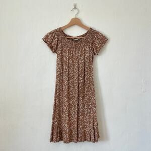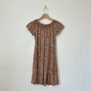 floaty, floral, and full of charm 🌸 this vintage go fish dress features a soft brown base with a delicate white floral print, smocked elastic neckline, and a relaxed pullover silhouette. the off-the-shoulder design adds a hint of romantic ease, while the rayon drape gives it that effortlessly feminine shape. perfect for spring picnics, sunday markets, or barefoot summer days.