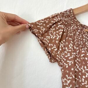 vintage floral mini dress, smocked off shoulder dress, cottagecore summer outfit, brown floral rayon dress, soft feminine mini, boho picnic dress, 2000s indie style, retro day dress, spring bloom aesthetic, effortless vacation outfit