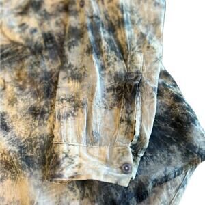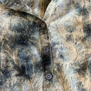 This half button-down tunic is made from 100% natural cotton voile fabric, with tonal floral embroidery on the collar, yoke, and the placket. It is also treated with a tie dye wash. The long sleeves can be worn down or rolled up and buttoned. It is in excellent, like new condition and will be shipped with care from a smoke free and pet free environment.